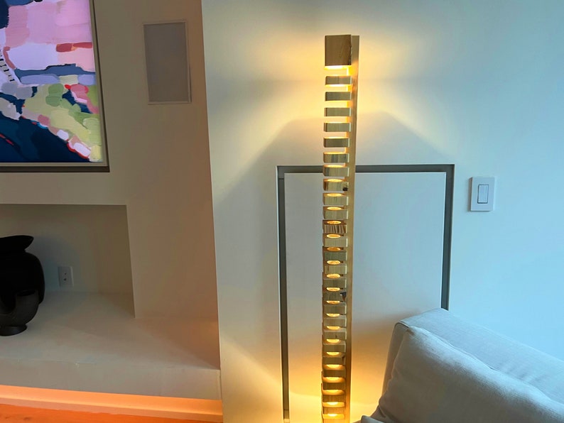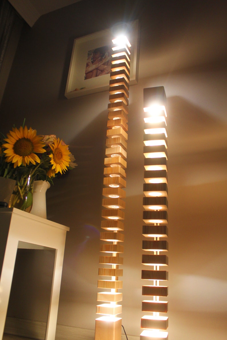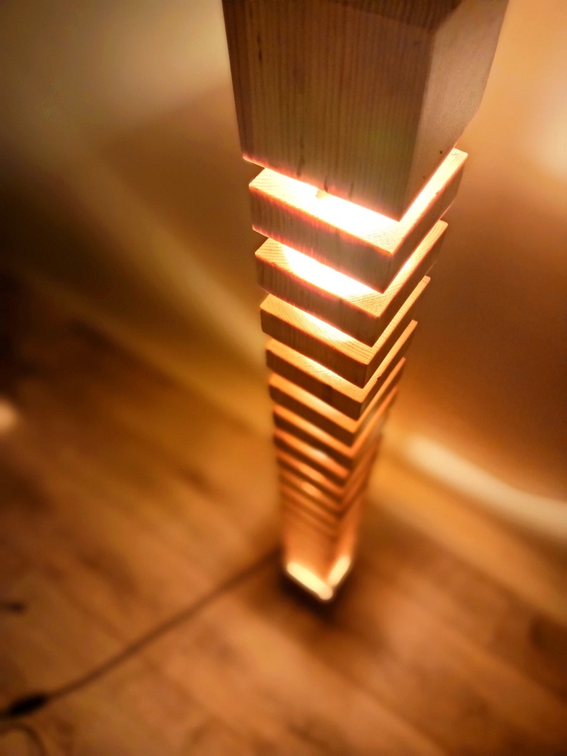 A massive hand-made wooden floor lamp .