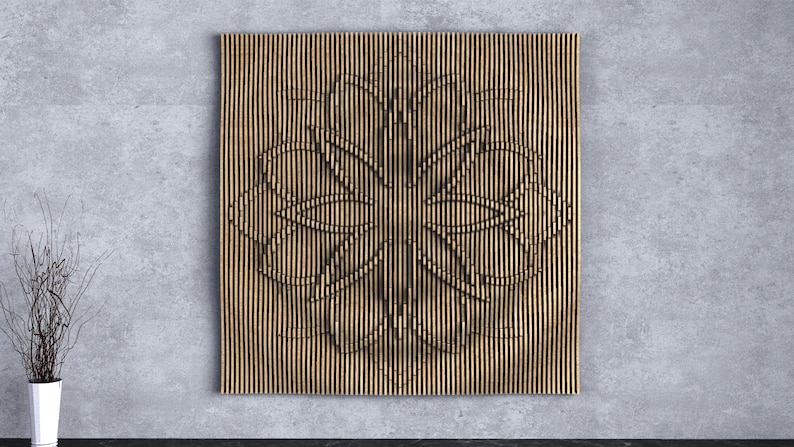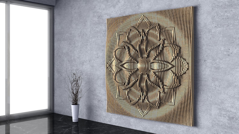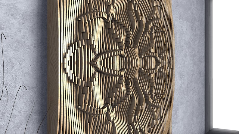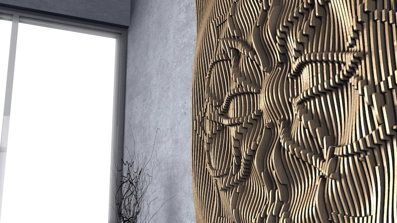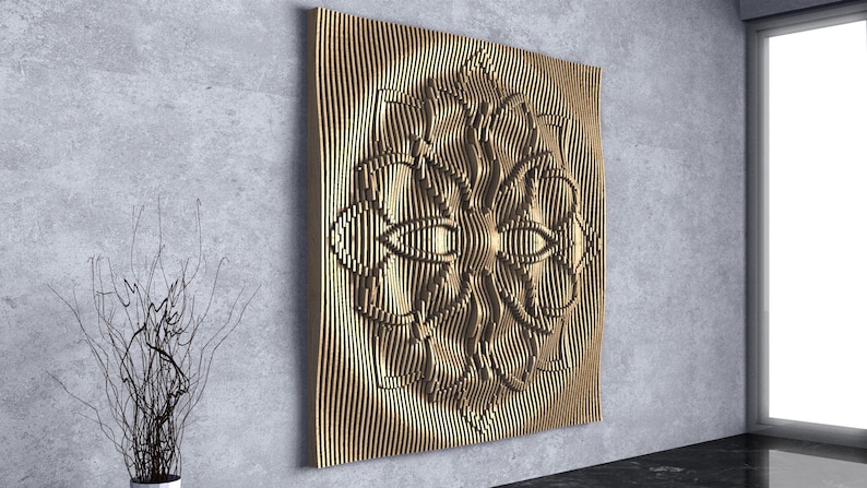 Parametric wavy wooden panels can be used in interior places. Parametric design with “Mandala Art” on wood panels. There are notches on backside of panels to assembly