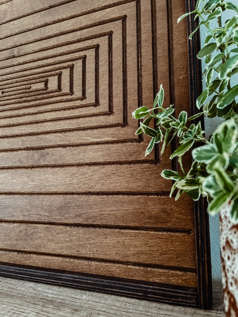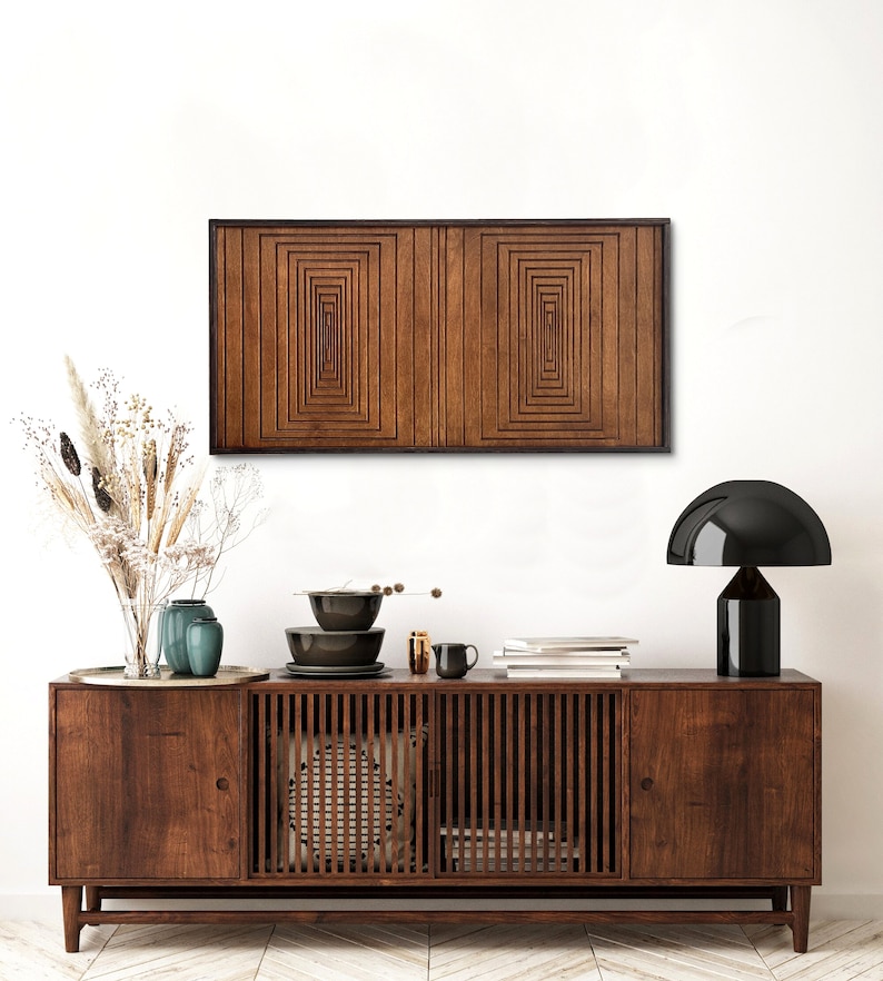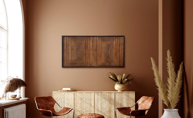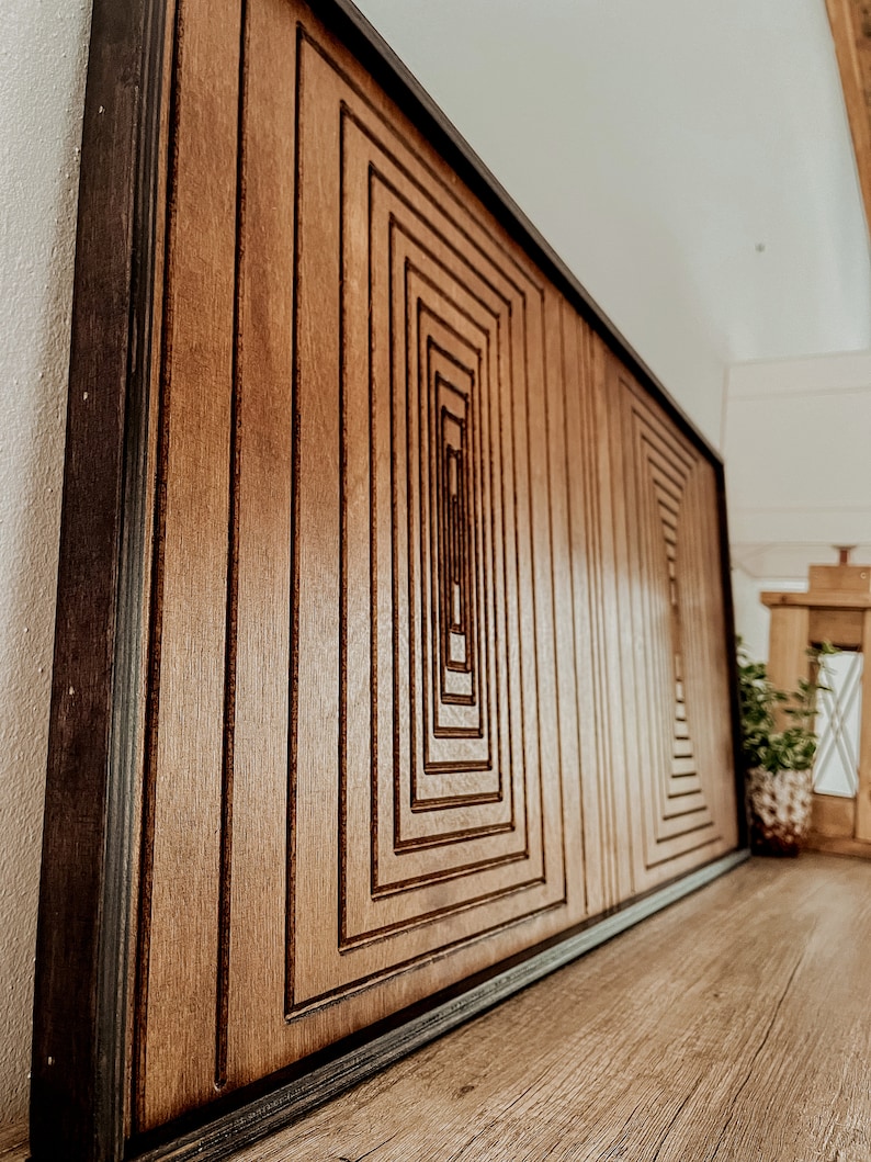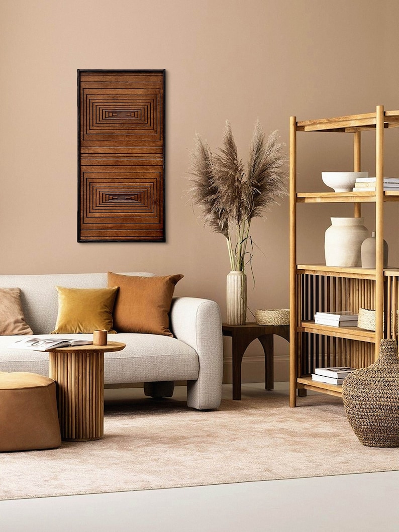 A modern minimalist geometric line art design creates an optical illusion when rustic wood wall art is framed within it.