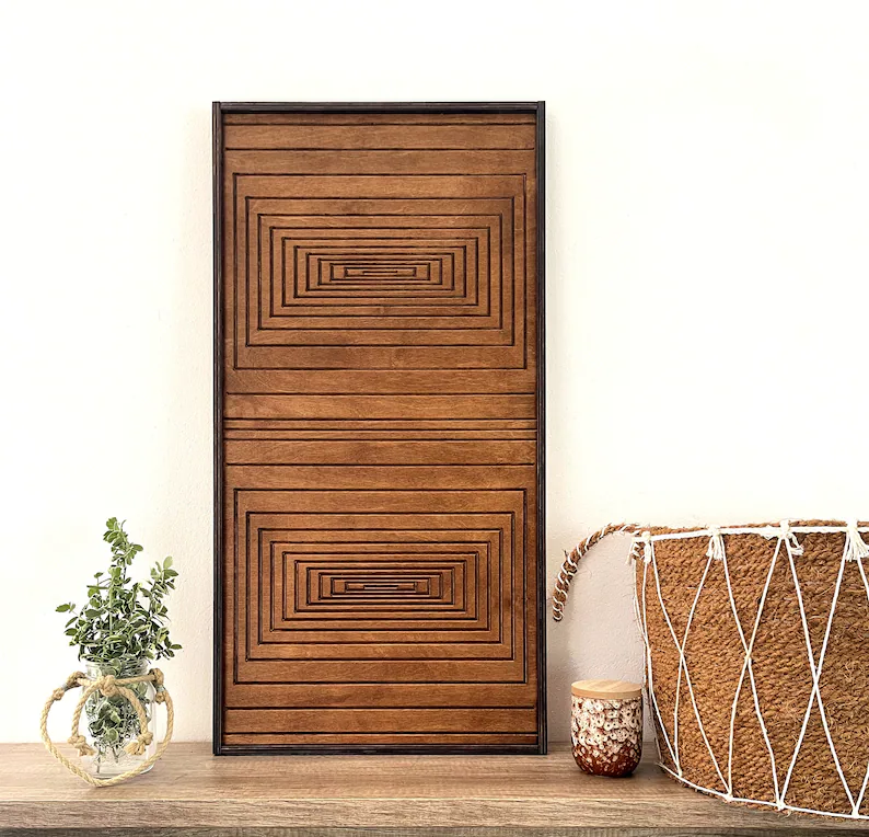 This listing includes a wooden wall art piece already framed with optical illusions of circles in a boho and monochrome design, adding a distinct touch to your apartment, living room, or above-bed decor.
